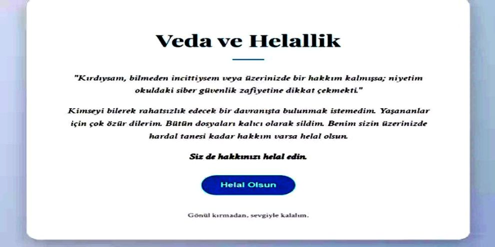 Kırdıysam, bilmeden incittiysem veya üzerinizde bir hakkım kalmışsa; niyetim okuldaki siber güvenlik zafiyetine dikkat çekmekti.