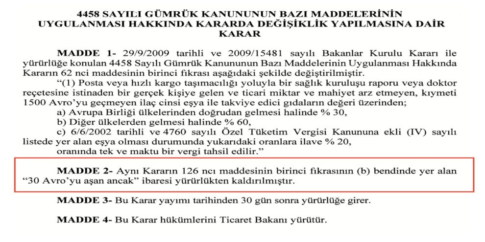 Düzenlemeyle birlikte, aynı kararda yer alan “30 Euro'yu aşan ancak” ibaresi yürürlükten kaldırıldı. Yeni kararla yurt dışından verilen tüm siparişler için ayrıntılı gümrük beyannamesi hazırlanacak. Tüketiciler, gümrük vergisi ile birlikte beyanname hizmet bedelini de ödemek zorunda olacak.