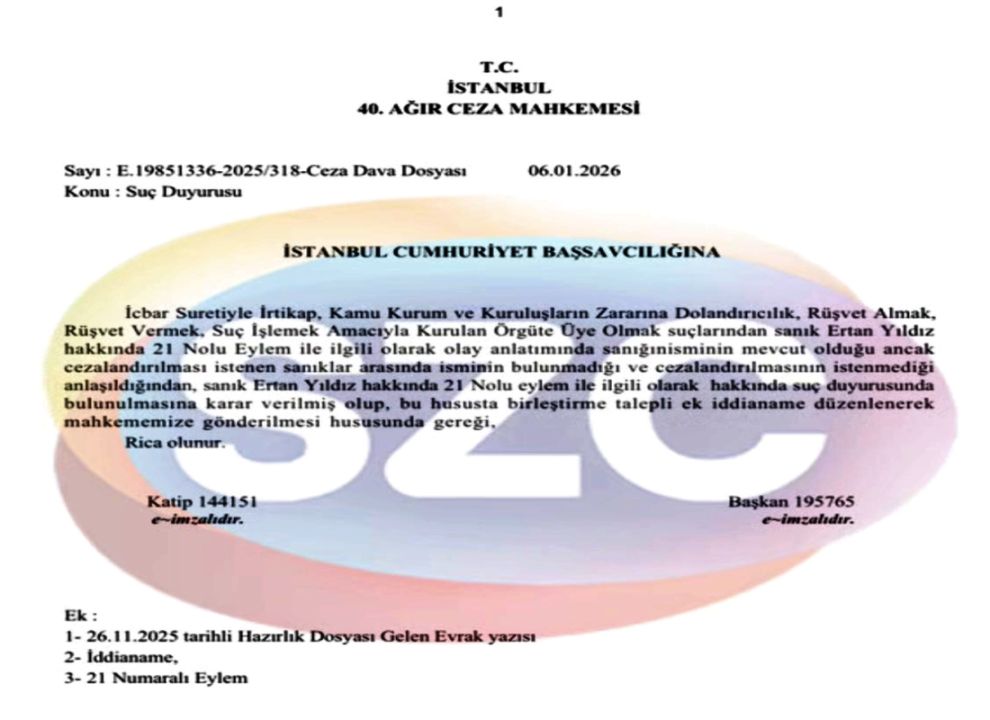 40. Ağır Ceza Mahkemesi, iddianamede yer alan ve suça konu edilen eylemler arasında 21 numaralı eylem için Ertan Yıldız hakkında ceza istenmemesi üzerine İstanbul Cumhuriyet Başsavcılığı'na suç duyurusunda bulundu. Mahkeme, birleştirme talepli ek iddianame düzenlenmesini talep etti.