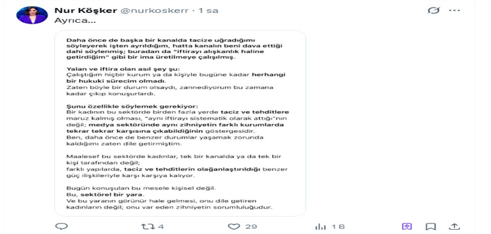Nur Köşker, son olarak yaptığı yeni açıklamada ise geçmişte başka bir kanalda da tacize uğradığını söyleyerek işten ayrıldığı ve bu nedenle dava edildiği yönündeki iddialara yanıt verdi. Köşker, bugüne kadar çalıştığı hiçbir kurum ya da kişiyle herhangi bir hukuki süreci olmadığını belirterek, bu yöndeki iddiaların yalan ve iftira olduğunu söyledi.