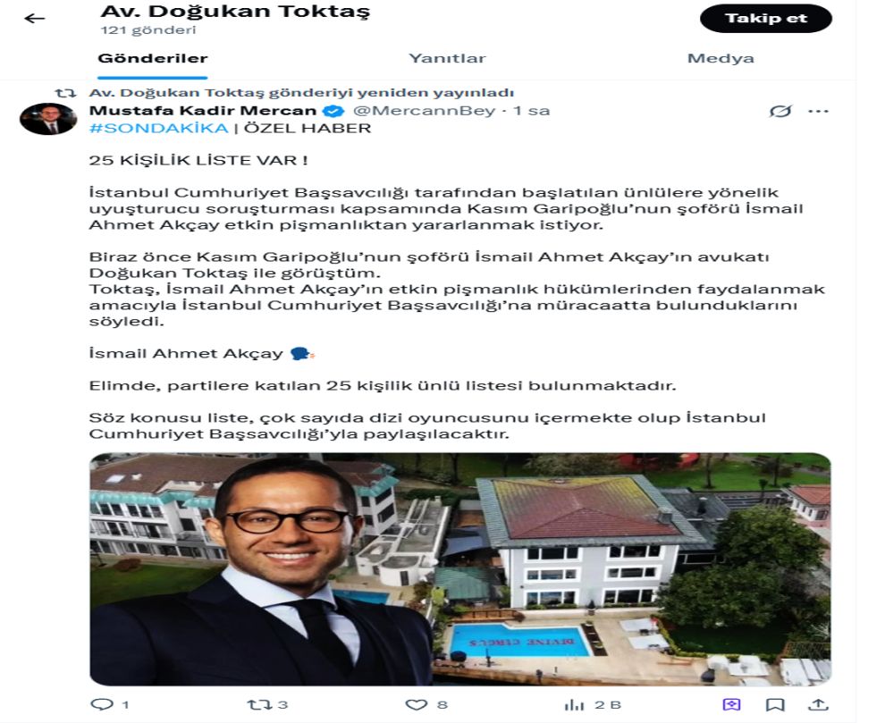 İstanbul'daki uyuşturucu soruşturmasında tutuklanan firari iş insanı Kasım Garipoğlu'nun şoförü İsmail Ahmet Akçay, etkin pişmanlıktan yararlanmak için savcılığa başvurdu. Avukatı aracılığıyla "Elimde partilere katılan 25 kişilik ünlü listesi var" diyen Akçay'ın, bu isimleri ifşa edeceği öğrenildi.