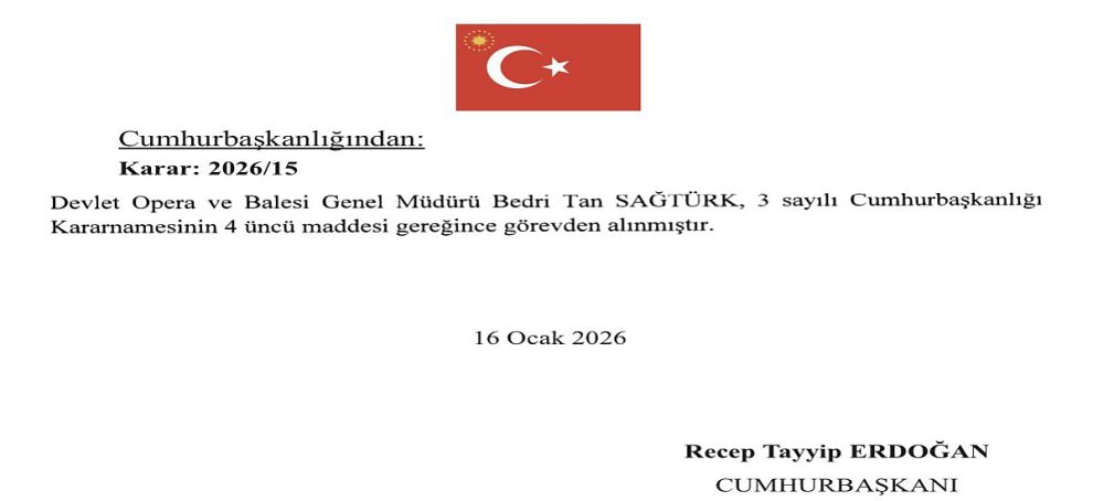Resmî Gazete'de yayımlanan karara göre; Devlet Opera ve Balesi Genel Müdürü Tan Sağtürk görevden alındı. 15 Eylül 2023'te genel müdürlük görevine atanan Sağtürk 2 yılın ardından görevden alındı.