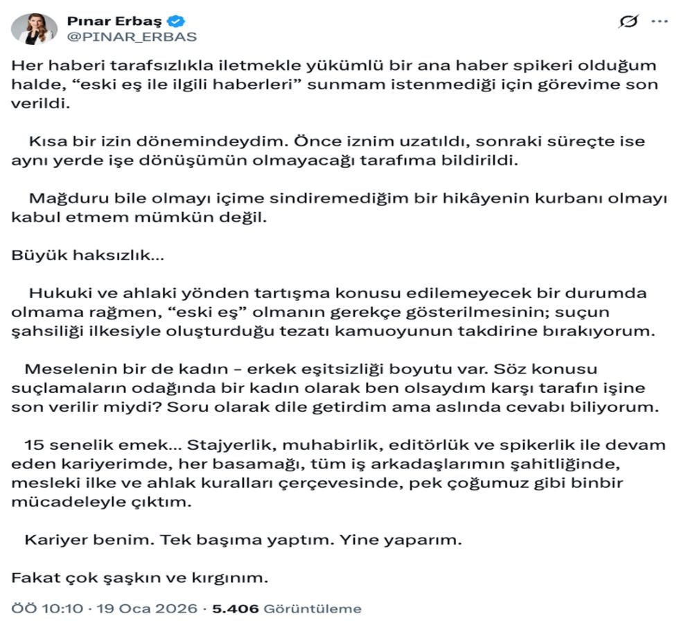 Pınar Erbaş, sosyal medya hesabından yaptığı açıklamada, "Her haberi tarafsızlıkla iletmekle yükümlü bir ana haber spikeri olduğum halde, 'eski eş ile ilgili haberleri' sunmam istenmediği için görevime son verildi. Kısa bir izin dönemindeydim. Önce iznim uzatıldı, sonraki süreçte ise aynı yerde işe dönüşümün olmayacağı tarafıma bildirildi" dedi.