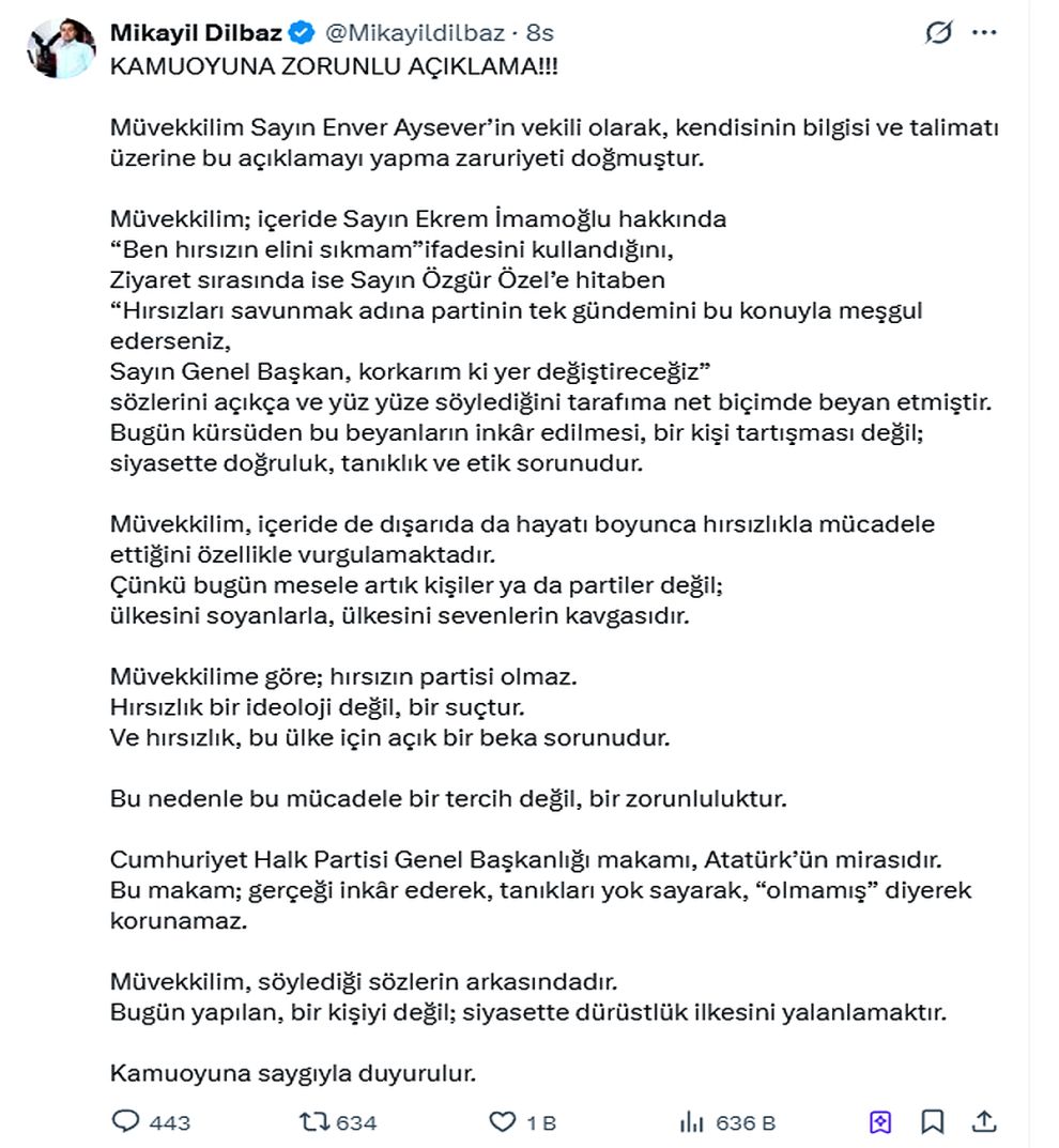"Bugün kürsüden bu beyanların inkâr edilmesi, bir kişi tartışması değil; siyasette doğruluk, tanıklık ve etik sorunudur. Müvekkilim, içeride de dışarıda da hayatı boyunca hırsızlıkla mücadele ettiğini özellikle vurgulamaktadır. Çünkü bugün mesele artık kişiler ya da partiler değil; ülkesini soyanlarla, ülkesini sevenlerin kavgasıdır. Müvekkilime göre; hırsızın partisi olmaz. Hırsızlık bir ideoloji değil, bir suçtur. Ve hırsızlık, bu ülke için açık bir beka sorunudur. Bu nedenle bu mücadele bir tercih değil, bir zorunluluktur. Cumhuriyet Halk Partisi Genel Başkanlığı makamı, Atatürk'ün mirasıdır. Bu makam; gerçeği inkâr ederek, tanıkları yok sayarak, "olmamış" diyerek korunamaz. Müvekkilim, söylediği sözlerin arkasındadır. Bugün yapılan, bir kişiyi değil; siyasette dürüstlük ilkesini yalanlamaktır. Kamuoyuna saygıyla duyurulur."