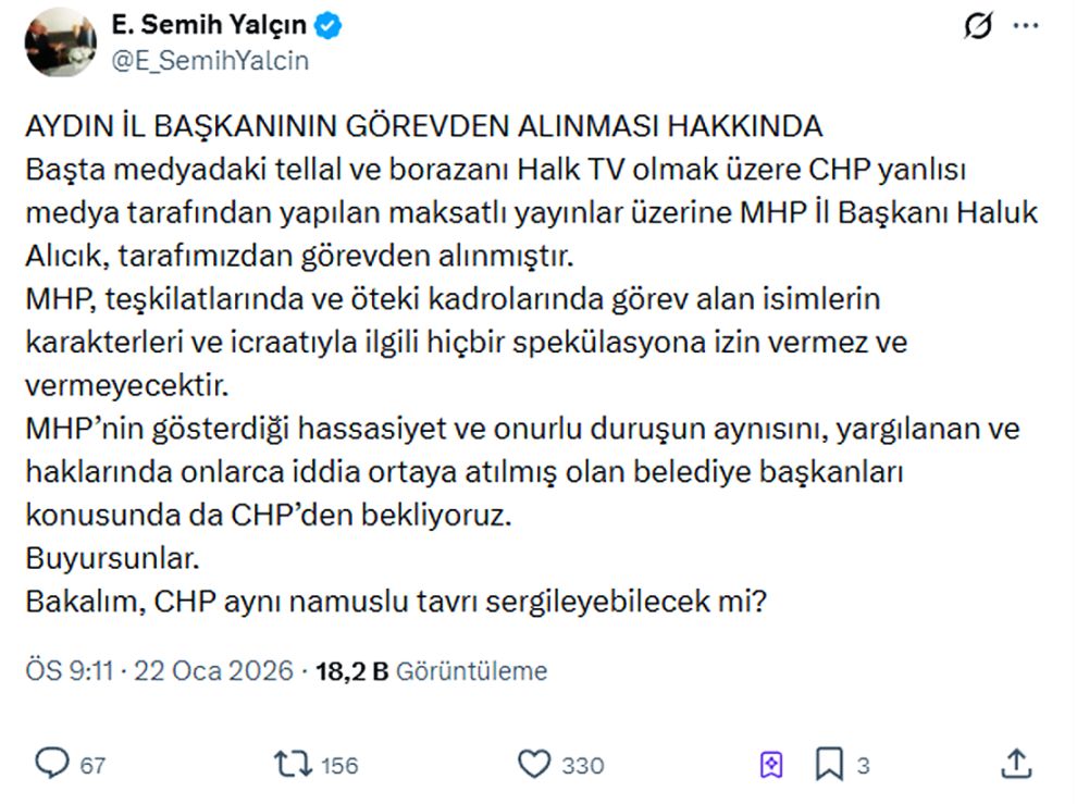 Yalçın açıklamasında, "Başta medyadaki tellal ve borazanı Halk TV olmak üzere CHP yanlısı medya tarafından yapılan maksatlı yayınlar üzerine MHP İl Başkanı Haluk Alıcık, tarafımızdan görevden alınmıştır" dedi.