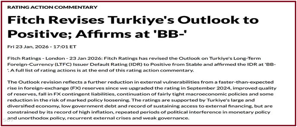 Fitch Ratings, Türkiye'nin kredi notunu "BB-" olarak teyit ederken, kredi notu görünümünü "durağan"dan "pozitif"e çevirdi.