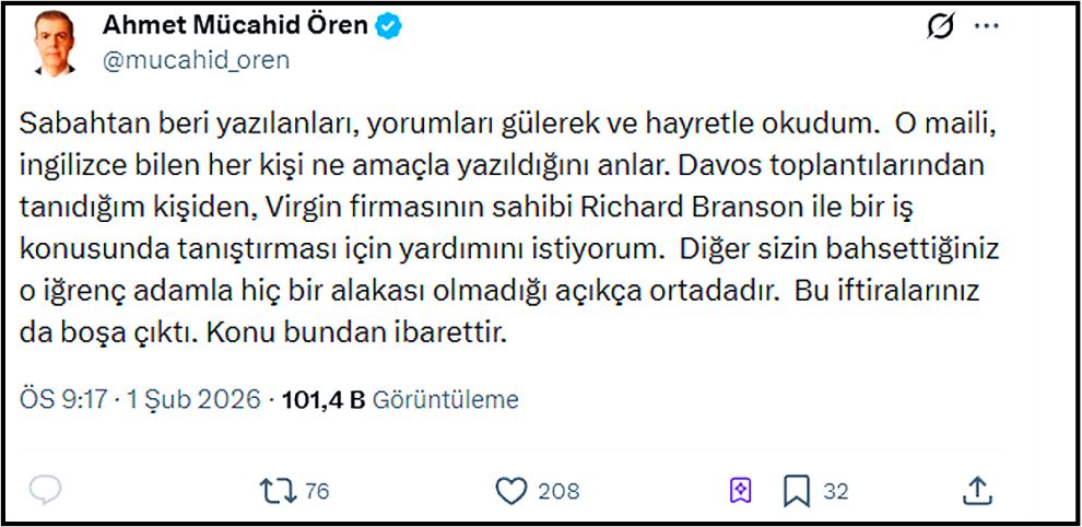 ABD Adalet Bakanlığı tarafından Jeffrey Epstein’in cinsel istismar ve fuhuş ağına ilişkin yayımlanan milyonlarca belge arasında, İhlas Holding’in CEO’su Ahmet Mücahit Ören’in yazışmalarının da yer aldığı iddia edildi. Konuya ilişkin açıklama yapan Ören, iddiaları yalanladı.