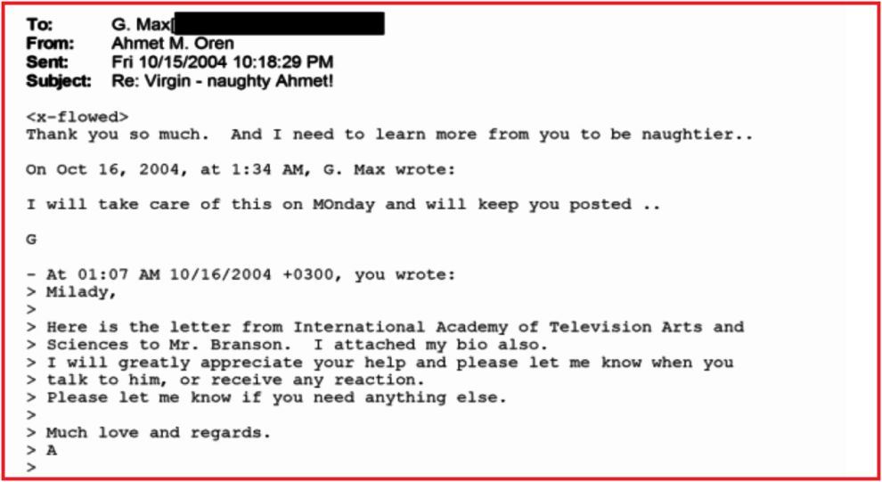 2004 tarihli konuşmanın çıktılarına göre ilk olarak Maxwell’in Ören’e “Bunu almayı dört gözle bekliyorum. Ayrıca bana kim olduğundan bahseden bir biyografini gönderebilirsen, bunu söylemekten nefret ediyorum ancak Richard (Branson) bir züppe ve sosyal statü avcısıdır.” ifadeleri yer alan bir mail gönderiyor.