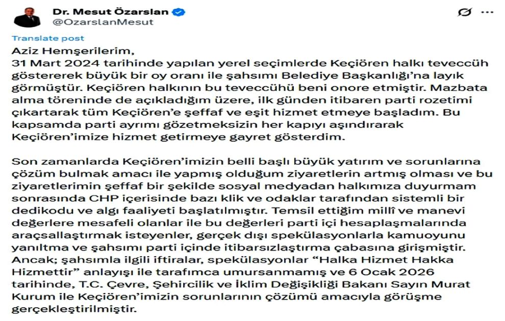 Ankara Keçiören Belediye Başkanı Mesut Özarslan CHP’den istifa ettiğini duyurdu.