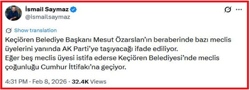 Keçiören Belediye Başkanı Mesut Özarslan’ın parti değiştirerek AK Parti’ye katılacağına ilişkin iddialar gündem olmuştu. Gazeteci İsmail Saymaz, söz konusu iddialar üzerine dikkat çeken bir kulis bilgisini paylaşarak "Keçiören Belediye Başkanı Mesut Özarslan’ı geçen hafta aramış, 'AK Parti’ye geçecek misiniz?' diye sormuştum. Özarslan, bu iddiayı yalanlamıştı. İki gündür arıyorum, mesaj atıyorum, Özarslan dönmüyor. Bugün güvenilir bir kaynaktan öğrendiğime göre Özarslan, AK Parti’ye katılıyor." ifadelerini kullanmıştı.