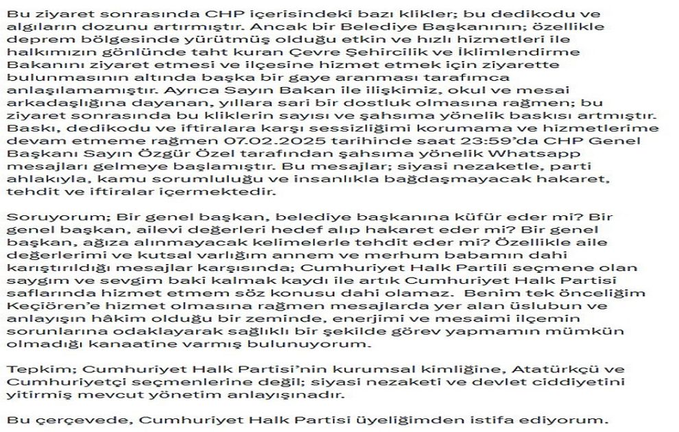 "Cumhuriyet Halk Partisi üyeliğimden istifa ediyorum. Her şeye rağmen birlikte yol yürüdüğüm Ankara Büyükşehir Belediye Başkanı Sayın Mansur Yavaş başta olmak üzere, Ankaralı diğer belediye başkanı arkadaşlarıma emekleri için teşekkür ediyorum. Hizmet odaklı siyasetin parti içi gerilimlere ve kırıcı üsluba kurban edilmemesi gerektiğine inanıyor; bu üsluba sahip bir yönetimin olduğu yerde siyaset yapma zemininin herkes tarafından yeniden değerlendirilmesi gerektiğini ifade ediyorum." ifadelerine yer verdi.