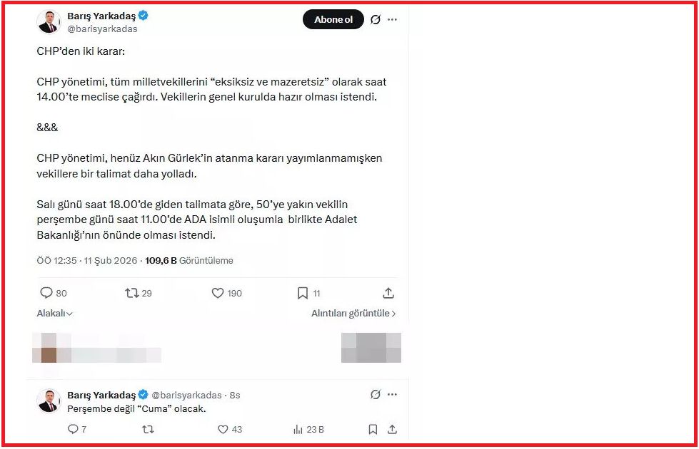 Gelişmeyi gazeteci Barış Yarkadaş, sosyal medya hesabından "CHP'den iki karar" başlığıyla duyurdu. Yarkadaş, CHP yönetiminin tüm milletvekillerini saat 14.00'te Meclis'e "eksiksiz ve mazeretsiz" olarak çağırdığını ve vekillerin Genel Kurul'da hazır bulunmasının istendiğini aktardı.