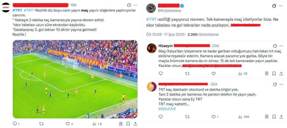 Öte yandan yayın yaklaşık 2 dakika boyunca taç kamerasıyla sürdü, Galatasaray'ın 3. golünün tekrarı ise 10 dakikadan fazla gecikmeyle ekrana geldi. X platformunda (eski Twitter) kullanıcılar, "yayın kesintisi", "tek kamera", "kulübeden yayın" gibi ifadelerle TRT'yi eleştirdi.