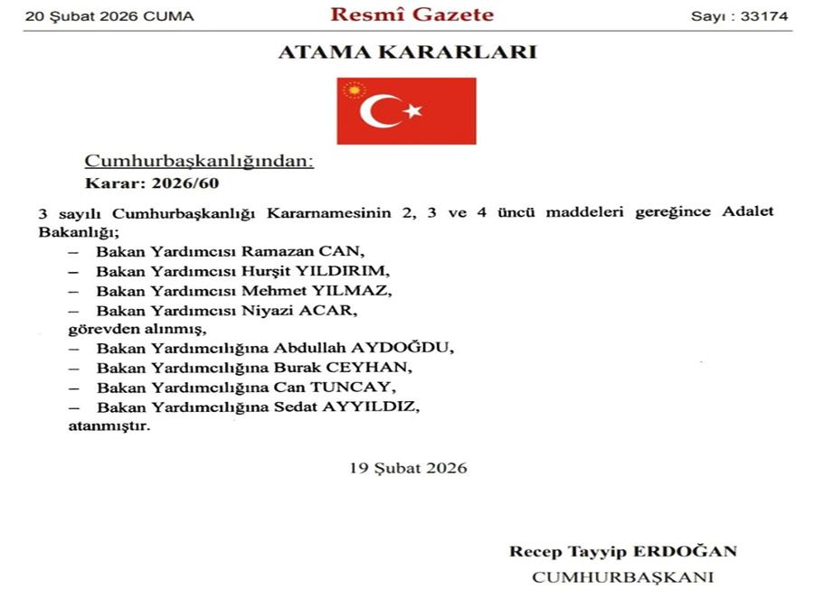 Resmi Gazete'de yayınlanan kararla birlikte Adalet Bakanı Yardımcıları'nın tamamı değişti. Abdullah Aydoğdu, Burak Ceyhan, Can Tuncay ve Sedat Akyıldız Adalet Bakan Yardımcısı görevlerine atandı.