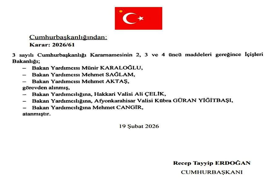 İçişleri Bakanlığı ve Adalet Bakanlığı'nda bakan yardımcıları değişti. Adalet Bakanlığı'nda Akın Gürlek'in yardımcıları olarak Abdullah Aydoğdu, Burak Ceyhan, Can Tuncay ve Sedat Akyıldız Adalet Bakan Yardımcısı görevlerine atandı. İçişleri Bakanlığı'nda ise Mustafa Çiftçi'nin yardımcıları olarak Hakkari Valisi Ali Çelik, Afyonkarahisar Valisi Kübra Güran Yiğitbaş ve Mehmet Cangır İçişleri Bakan Yardımıcısı görevlerine getirildi. Aynı kararla 5 ilin valiliğine yeni isimler atandı.