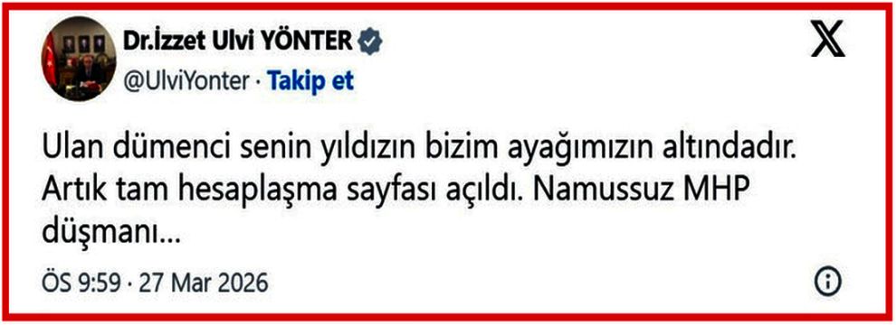 Yönter, söz konusu paylaşımında, "MHP’ye sızan ajan seni her cihetten izliyoruz. Sen doğruluktan ne anlarsın! Merak etme seninle mutlaka hesaplaşacağız…Paran da işe yaramayacak dümenci alçak…" ifadelerini kullandı.