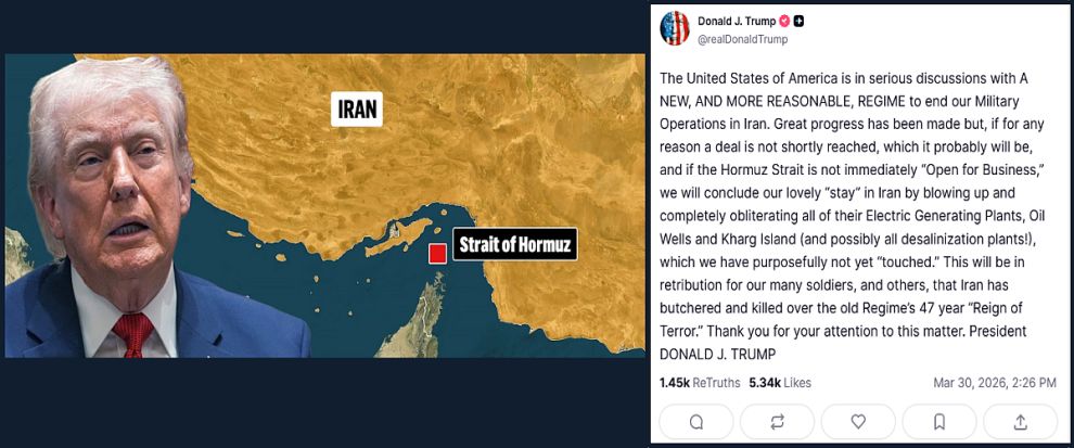"Amerika Birleşik Devletleri, İran’daki askeri operasyonlarımızı sona erdirmek amacıyla yeni ve daha makul bir rejimle ciddi görüşmeler yürütmektedir. Büyük ilerleme kaydedilmiştir; ancak herhangi bir nedenle kısa süre içinde bir anlaşmaya varılamazsa, ki muhtemelen varılacaktır, ve Hürmüz Boğazı derhal “ticarete açık” hale getirilmezse, İran’daki 'bulunuşumuzu' şimdiye kadar özellikle 'dokunmadığımız' tüm elektrik üretim tesislerini, petrol kuyularını ve Hark Adası’nı (ve muhtemelen tüm tuzdan arındırma tesislerini!) havaya uçurup tamamen yok ederek sonlandıracağız. Bu, İran’ın eski rejiminin 47 yıllık 'terör saltanatı' boyunca katlettiği ve öldürdüğü çok sayıdaki askerimiz ve diğer kişiler için bir karşılık olacaktır. İlginiz için teşekkür ederim."
