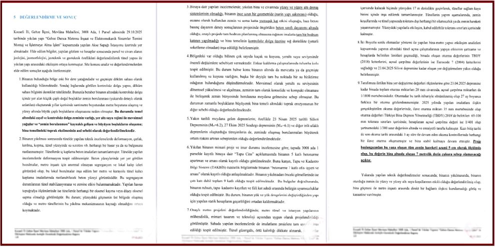 İlk yerel bilirkişi raporunda öne sürülen "metro inşaatı etkisi" varsayımları, bilimsel verilerle yanıt buldu. Teknik raporda yer alan veriler şu şekilde sıralandı: