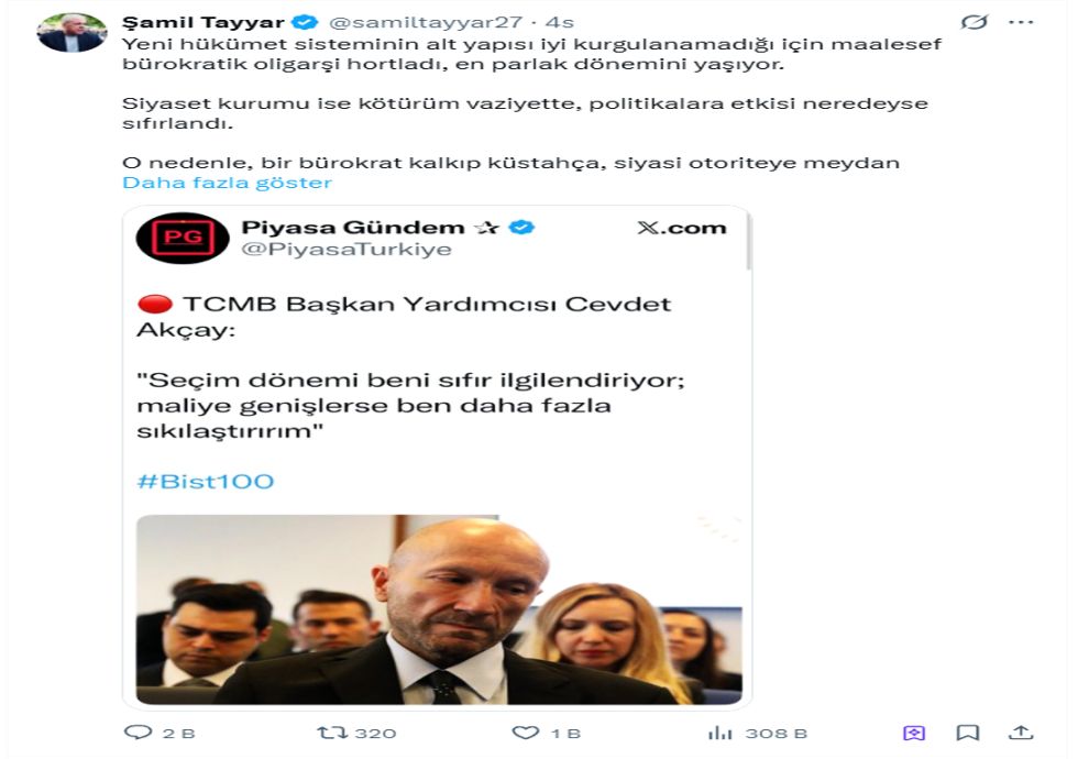 TCMB Başkan Yardımcısı Osman Cevdet Akçay’ın "Seçim dönemi beni ilgilendirmez" çıkışına, gazeteci Şamil Tayyar’dan zehir zemberek bir yanıt geldi. Akçay’ın ifadelerini "küstahlık" ve "siyasete ayar verme çabası" olarak nitelendiren Tayyar, sosyal medya hesabından Osman Cevdet Akçay'a tepki göstererek, "Haddini bil, işine bak. Siyasete ayar vermeye kalkma" dedi.