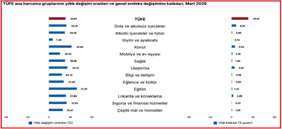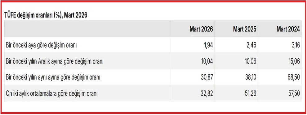 Milyonların merakla beklediği enflasyon rakamları açıklandı. TÜİK'ten yapılan açıklamaya göre, TÜFE'deki (2025=100) değişim 2026 yılı Mart ayında bir önceki aya göre %1,94 artış, bir önceki yılın Aralık ayına göre %10,04 artış, bir önceki yılın aynı ayına göre %30,87 artış ve on iki aylık ortalamalara göre %32,82 artış olarak gerçekleşti.