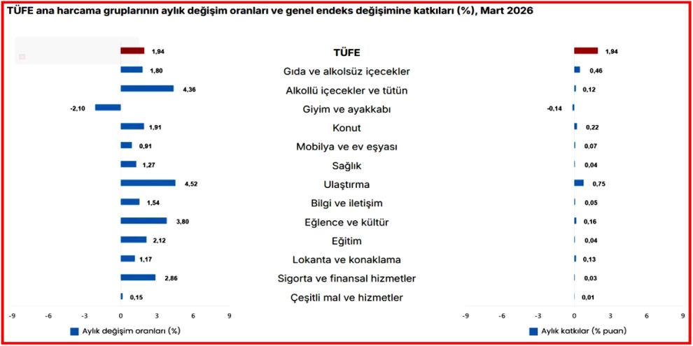 En yüksek ağırlığa sahip üç ana harcama grubunun aylık değişimleri; gıda ve alkolsüz içeceklerde %1,80 artış, ulaştırmada %4,52 artış ve konut, su, elektrik, gaz ve diğer yakıtlarda %1,91 artış olarak gerçekleşti. İlgili ana grupların aylık değişime olan katkıları ise gıda ve alkolsüz içeceklerde 0,46, ulaştırmada 0,75 ve konutta 0,22 yüzde puan oldu.
