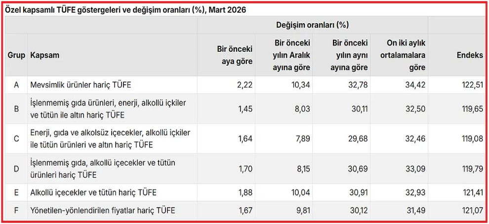 İşlenmemiş gıda ürünleri, enerji, alkollü içkiler ve tütün ile altın hariç TÜFE'deki değişim, 2026 yılı Mart ayında bir önceki aya göre %1,45 artış, bir önceki yılın Aralık ayına göre %8,03 artış, bir önceki yılın aynı ayına göre %30,11 artış ve on iki aylık ortalamalara göre %32,50 artış olarak gerçekleşti.