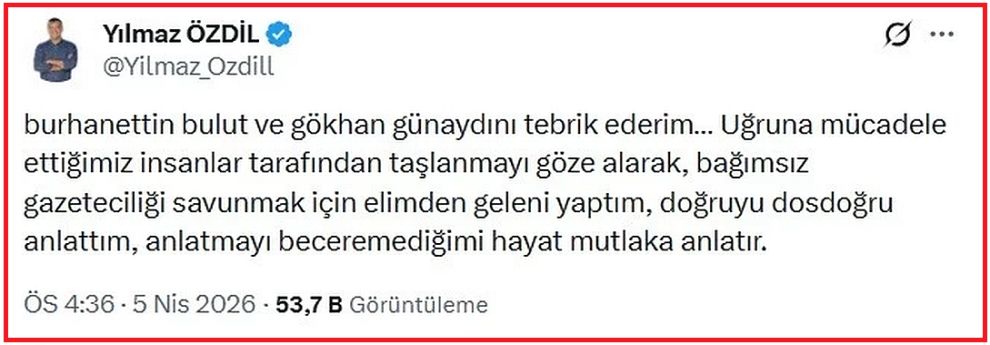 "Burhanettin Bulut ve Gökhan Günaydın’ı tebrik ederim… Uğruna mücadele ettiğimiz insanlar tarafından taşlanmayı göze alarak, bağımsız gazeteciliği savunmak için elimden geleni yaptım. Doğruyu dosdoğru anlattım; benim anlatmayı beceremediğimi hayat mutlaka anlatır."