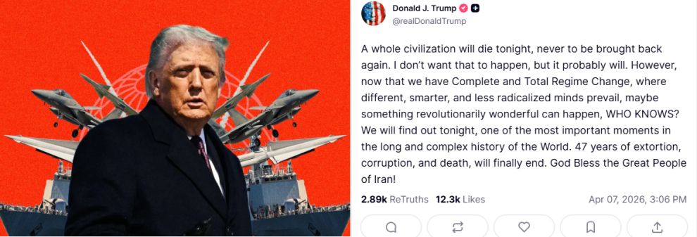 “Bu gece bütün bir medeniyet yok olacak ve bir daha asla geri gelmeyecek. Bunun olmasını istemiyorum, ama muhtemelen olacak. Ancak, artık farklı, daha akıllı ve daha az radikalleşmiş zihinlerin hakim olduğu Tam ve Kapsamlı Bir Rejim Değişimi yaşandığından, belki de devrim niteliğinde harika bir şey olabilir, KİM BİLİR? Bunu bu gece öğreneceğiz; bu, dünyanın uzun ve karmaşık tarihindeki en önemli anlardan biri olacak. 47 yıllık gasp, yolsuzluk ve ölüm nihayet sona erecek. Tanrı İran'ın büyük halkını korusun!”