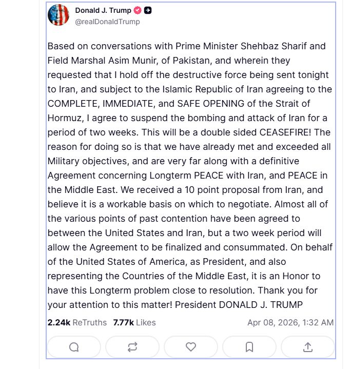"Pakistan Başbakanı Şehbaz Şerif ve Mareşal Asim Munir ile yaptığım görüşmeler neticesinde, bu gece İran’a gönderilecek yıkıcı gücü durdurmamı talep ettiler ve İran İslam Cumhuriyeti’nin Hürmüz Boğazı’nın TAM, DERHAL ve GÜVENLİ bir şekilde AÇILMASINI kabul etmesi şartıyla, İran’a yönelik bombardıman ve saldırıları iki haftalık bir süre için askıya almayı kabul ediyorum. Bu, iki taraflı bir ATEŞKES olacaktır! Bunun nedeni, tüm askeri hedeflerimizi zaten gerçekleştirmiş ve aşmış olmamız ve İran ile uzun vadeli BARIŞ ve Orta Doğu'da BARIŞ konusunda kesin bir Anlaşma'ya çok yaklaşmış olmamızdır. İran'dan 10 maddelik bir teklif aldık ve bunun müzakere için uygulanabilir bir temel olduğuna inanıyoruz. Geçmişteki ihtilaf konularının neredeyse tamamı üzerinde Amerika Birleşik Devletleri ile İran arasında mutabakat sağlanmıştır, ancak iki haftalık bir süre anlaşmanın son halini almasına ve tamamlanmasına imkan verecektir. Amerika Birleşik Devletleri Başkanı olarak ve aynı zamanda Ortadoğu ülkelerini temsilen, bu uzun vadeli sorunun çözüme yakın olması benim için bir onurdur. Bu konuya gösterdiğiniz ilgi için teşekkür ederim!