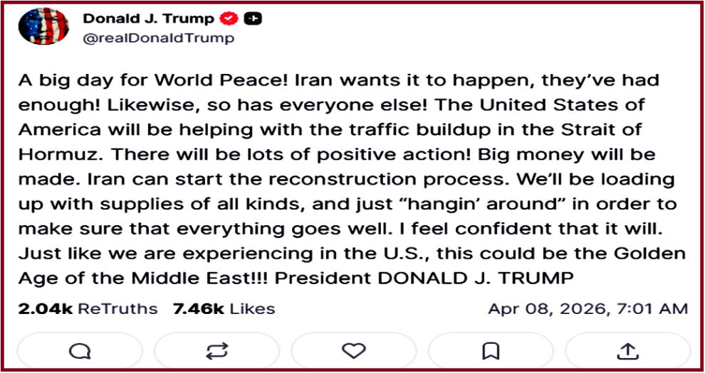 ABD Başkanı Donald Trump sosyal medya hesabı üzerinden yaptığı paylaşımda Pakistan'ın talebi üzerine yapılan görüşmeler kapsamında İran ile 2 haftalık bir ateşkes anlaşması olduğunu söyledi. Trump, sosyal medya hesabından ateşkes hakkında yaptığı son açıklamasında, "Dünya barışı için büyük bir gün! Tıpkı ABD'de yaşadığımız gibi, bu Ortadoğu'nun Altın Çağı olabilir!!! "