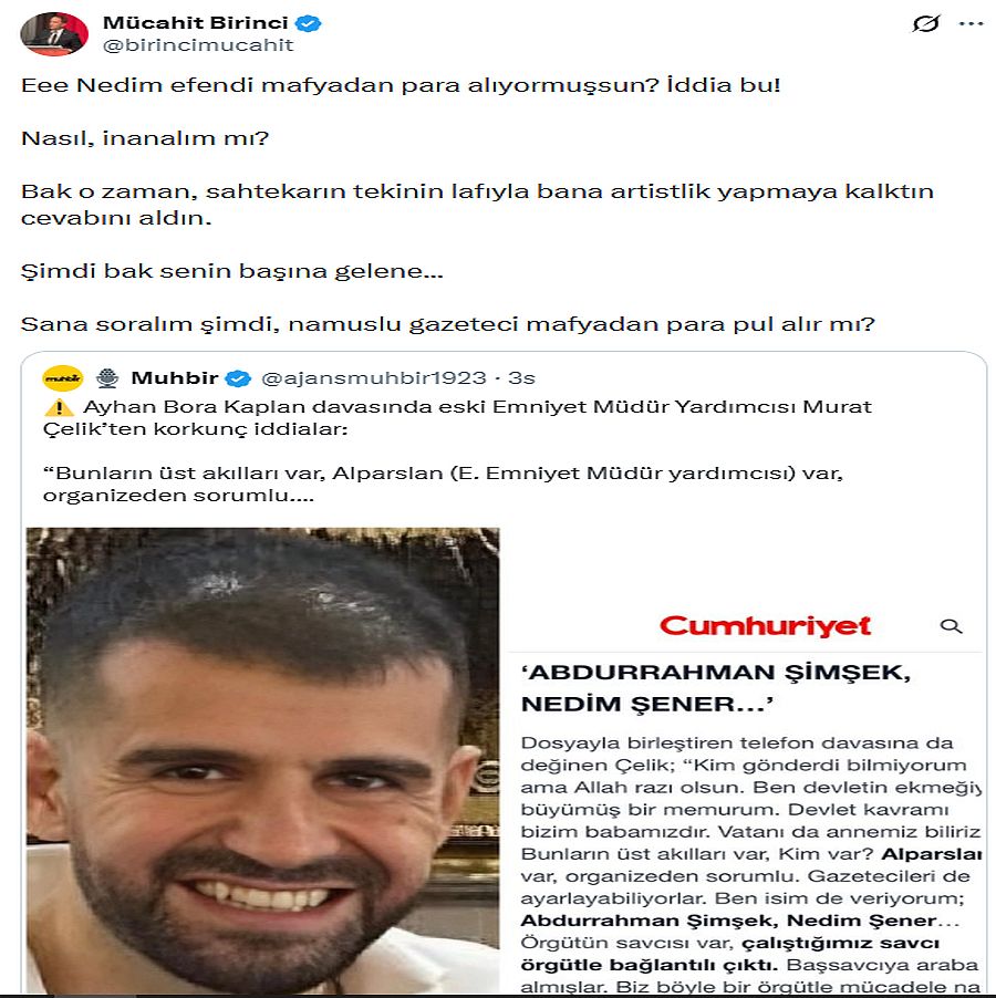 Ayhan Bora Kaplan davasında eski Emniyet Müdür Yardımcısı Murat Çelik'in, "Gazetecileri de ayarlayabiliyorlar." diyerek gazeteci Nedim Şener'in adını verdiği ifadesinin ardından eski AK Parti MKYK üyesi avukat Mücahit Birinci ile Şener arasında polemik yaşandı. Birinci'nin, "Eee Nedim efendi mafyadan para alıyormuşsun?" sözlerine, Şener'den, "İspatlamayan şerefsizdir" yanıtı geldi.