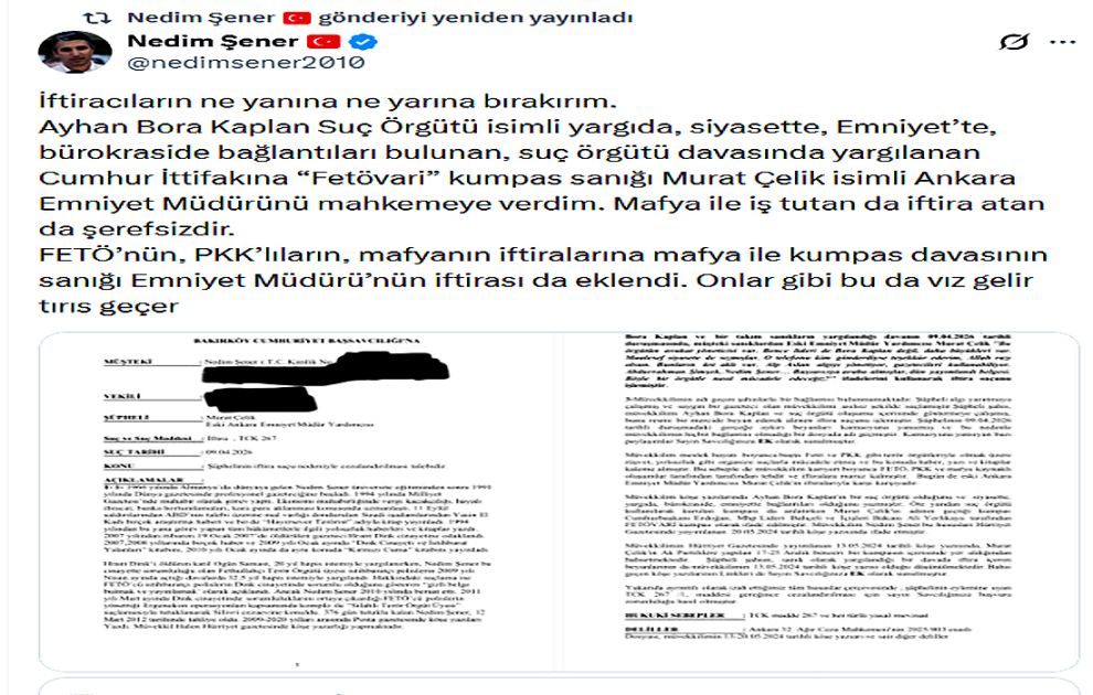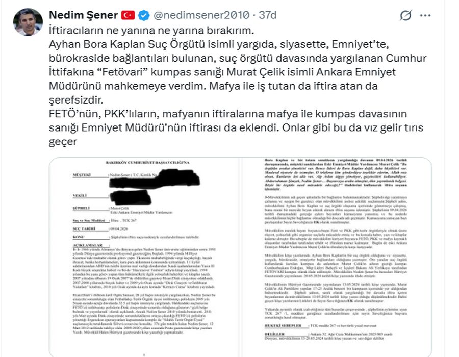 "İftiracıların ne yanına ne yarına bırakırım. Ayhan Bora Kaplan Suç Örgütü isimli yargıda, siyasette, Emniyet’te, bürokraside bağlantıları bulunan, suç örgütü davasında yargılanan Cumhur İttifakına “Fetövari” kumpas sanığı Murat Çelik isimli Ankara Emniyet Müdürünü mahkemeye verdim. Mafya ile iş tutan da iftira atan da şerefsizdir. FETÖ’nün, PKK’lıların, mafyanın iftiralarına mafya ile kumpas davasının sanığı Emniyet Müdürü’nün iftirası da eklendi. Onlar gibi bu da vız gelir tırıs geçer."