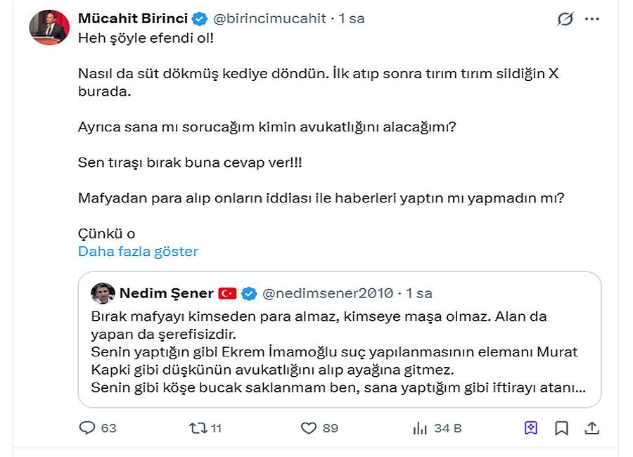Nedim Şener ise "Bırak mafyayı kimseden para almaz, kimseye maşa olmaz. Alan da yapan da şerefsizdir. Senin yaptığın gibi Ekrem İmamoğlu suç yapılanmasının elemanı Murat Kapki gibi düşkünün avukatlığını alıp ayağına gitmez. Senin gibi köşe bucak saklanmam ben, sana yaptığım gibi iftirayı atanı da bugün mahkemeye veriyorum. İspatlamayan da şerefsizdir." yanıtını verdi.