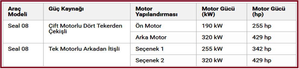 Çin'in Sanayi ve Bilgi Teknolojileri Bakanlığı’nın resmi verilerine göre, performans tarafında da iddialı bir tablo var. Homologasyon belgelerine göre Seal 08’in en güçlü versiyonu yaklaşık 684 beygir güç üretiyor.