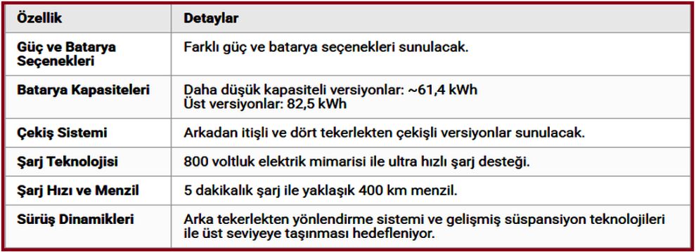 Araçta farklı güç ve batarya seçenekleri sunulması bekleniyor. Daha düşük kapasiteli versiyonlarda yaklaşık 61,4 kWh, üst versiyonlarda ise 82,5 kWh’lık batarya paketleri yer alması bekleniyor. Modelin arkadan itiş ve dört tekerlekten çekişli versiyonlarının da sunulacağı ifade ediliyor.