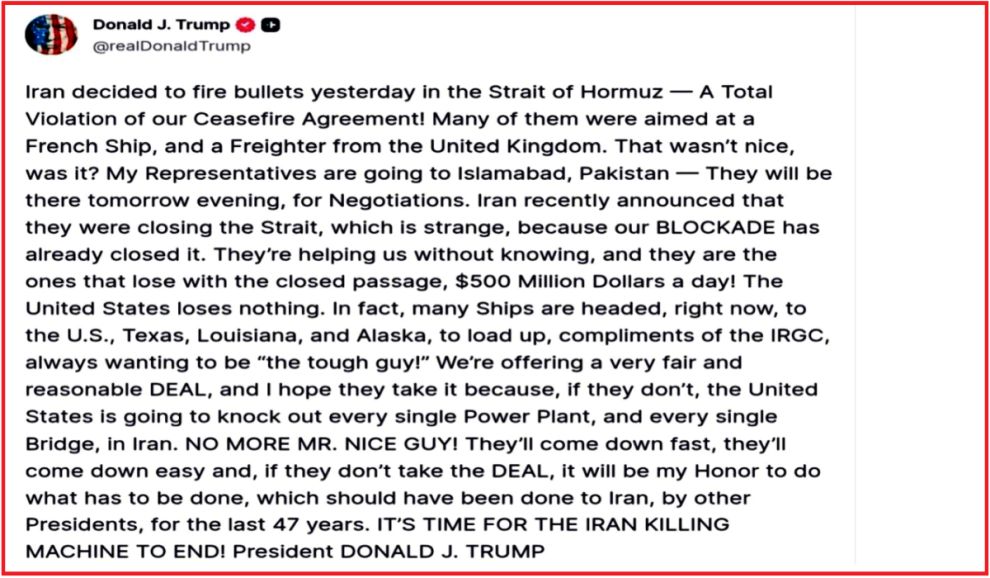 Farkında olmadan bize yardım ediyorlar ve kapalı geçişten asıl zararı onlar görüyor, günde 500 milyon dolar! Amerika Birleşik Devletleri hiçbir şey kaybetmiyor. Hatta şu anda birçok gemi, Texas, Louisiana ve Alaska’ya doğru yola çıktı, yük almak için, hepsi İran Devrim Muhafızları’nın “sert görünme” çabaları sayesinde!Çok adil ve makul bir anlaşma teklif ediyoruz ve umarım bunu kabul ederler. Çünkü kabul etmezlerse, ABD İran’daki her bir enerji santralini ve her bir köprüyü yok edecek.