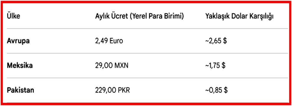 Abonelik ücretleri, ülkelerin ekonomik koşullarına göre esneklik gösterecek. İlk sızan verilere göre fiyatlandırma tablosu şu şekilde: