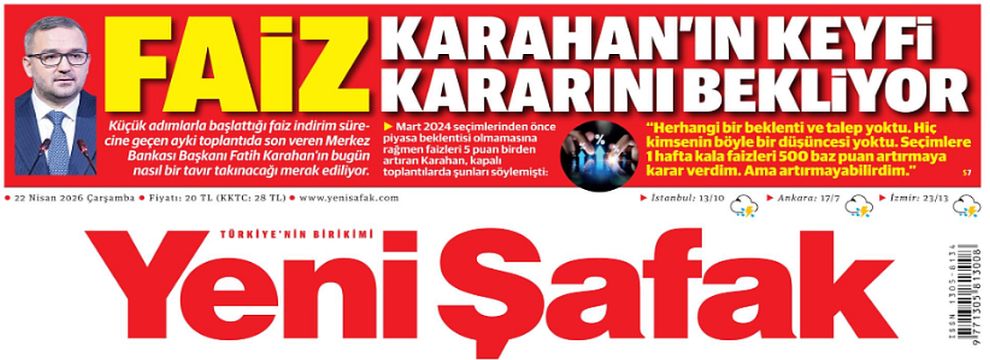 İktidara yakınlığıyla bilinen Yeni Şafak gazetesi, Türkiye Cumhuriyet Merkez Bankası’nın (TCMB) bugün açıklayacağı faiz kararı öncesinde Başkan Fatih Karahan’ı sürmanşetten hedef aldı. Gazete, Karahan’ın para politikası yönetimini "keyfi" ve "aşırı temkinli" olarak nitelendirirken, iş dünyasının bu tutum nedeniyle çıkmaza girdiğini öne sürdü.