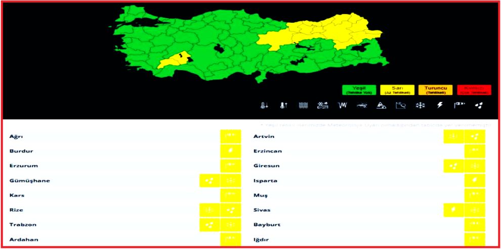 Bu bölgelerde yaşanabilecek olumsuzluklara karşı vatandaşların tedbirli olması istenirken; Doğu Karadeniz ve Doğu Anadolu’nun eğimli bölgeleri için "çığ ve kar erimesi" tehlikesine karşı bir kez daha uyarı yapıldı.