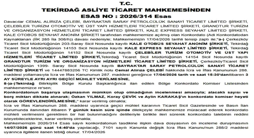 Tekirdağ Asliye Ticaret Mahkemesi, Kale Seyahat ve bağlantılı şirketlere geçici konkordato ilan etti. Cemal Alirıza Çelebi, Bayraktar Saray Petrolcülük, Çelebiler Turizm Otomotiv, Grandtur Turizm, Kale Express Seyahat, Kale Otobüs Seyahat şirketlerine 3 ay süreyle geçici konkordato mühleti verildi.