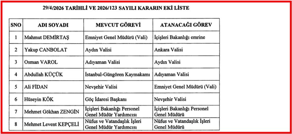 Öte yandan Emniyet Genel Müdürü Mahmut Demirtaş görevden alınırken, yerine Nevşehir Valisi Ali Fidan atandı.