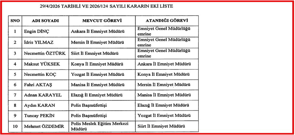 Resmi Gazete’de yayımlanan atama kararına göre; Ankara İl Emniyet Müdürü Engin Dinç, Emniyet Genel Müdürlüğü emrine alınırken, yerine Konya İl Emniyet Müdürü Maksut Yüksek atandı.