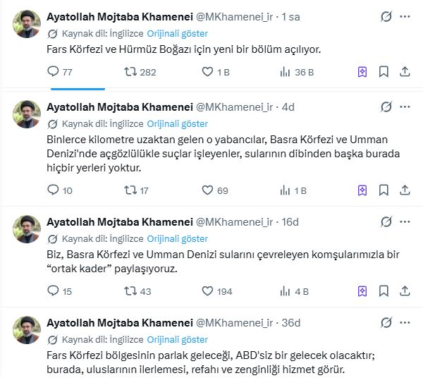 İran'ın dini lideri Mücteba Hamaney, sosyal medya platformu X üzerinden paylaşımlar yaptı. “Ulusal Körfez Günü” nedeniyle yaptığı paylaşımda Hamaney, Körfez ve Hürmüz Boğazı için yeni bir dönemin başladığını, Amerikan varlığı olmadan Körfez'in parlak bir geleceğe sahip olduğunu söyledi.