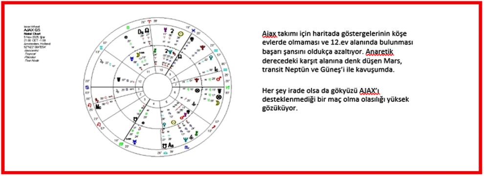 Geçtiğimiz sezonun şampiyonu olarak lige başlayan Galatasaray, bu yıl Avrupa Şampiyonlar Ligi'nde büyük bir başarı hedefliyor. Kasım ayında biri Hollanda’da olmak üzere iki Şampiyonlar Ligi maçı oynayacaklar. Bu maçlardan biri, geçtiğimiz yıl Ocak 2025'te mağlup oldukları Ajax’a karşı olacak ve bu kez başarı şansı oldukça yüksek görünüyor. Taraftar desteği, Ay ve transit Güneş’in güçlü etkileşimiyle adeta takımın 12. oyuncusu hissiyatını yaratabilir.