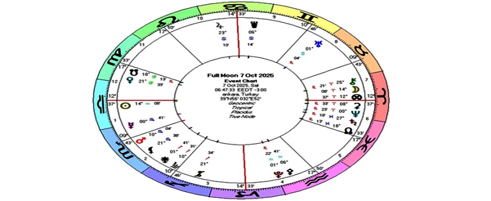7 Ekim sabahı saat 06:47’de, Koç burcunun 14. derecesinde güçlü bir dolunay gerçekleşecek. Terazi-Koç aksı, “ben” ve “biz” eksenini temsil eder; ikili ilişkilerdeki rekabet, işbirliği, karar ve kararsızlık temalarını gündeme getirir. Bu dolunayın gerilimli enerjisi, bizi önemli bir karar verme sürecine sürüklemekte. Unutulmamalıdır ki, her karar yeni bir başlangıcı anlatır.