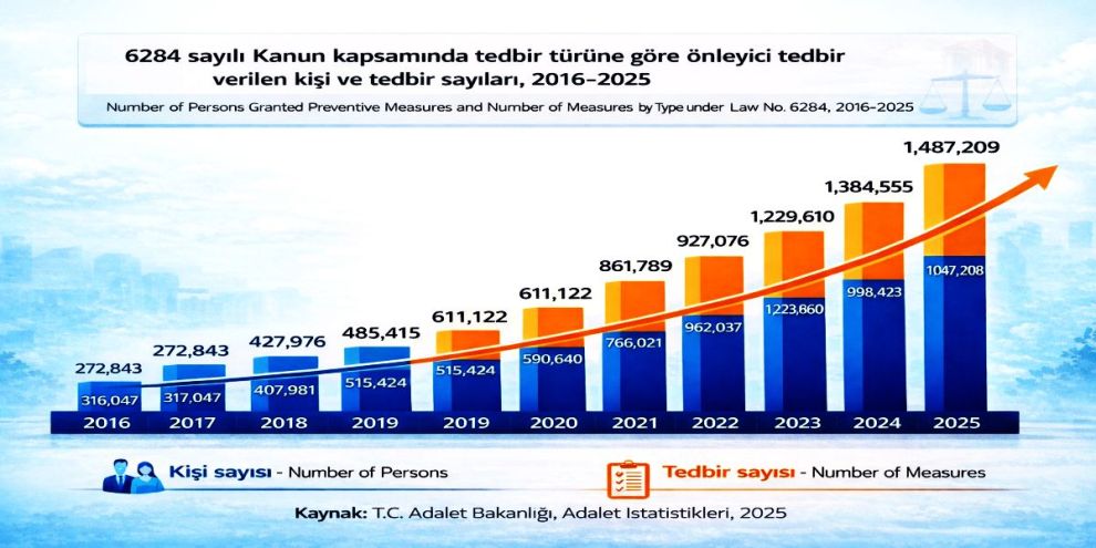 Adalet Bakanlığı tarafından hazırlanan 2025 yılı adalet istatistiklerine göre; geçtiğimiz yıl 6284 sayılı kanun kapsamında, bir milyonun üzerinde kadın ve çocuk hakkında toplam 1.487.209 tedbir kararı verildi.